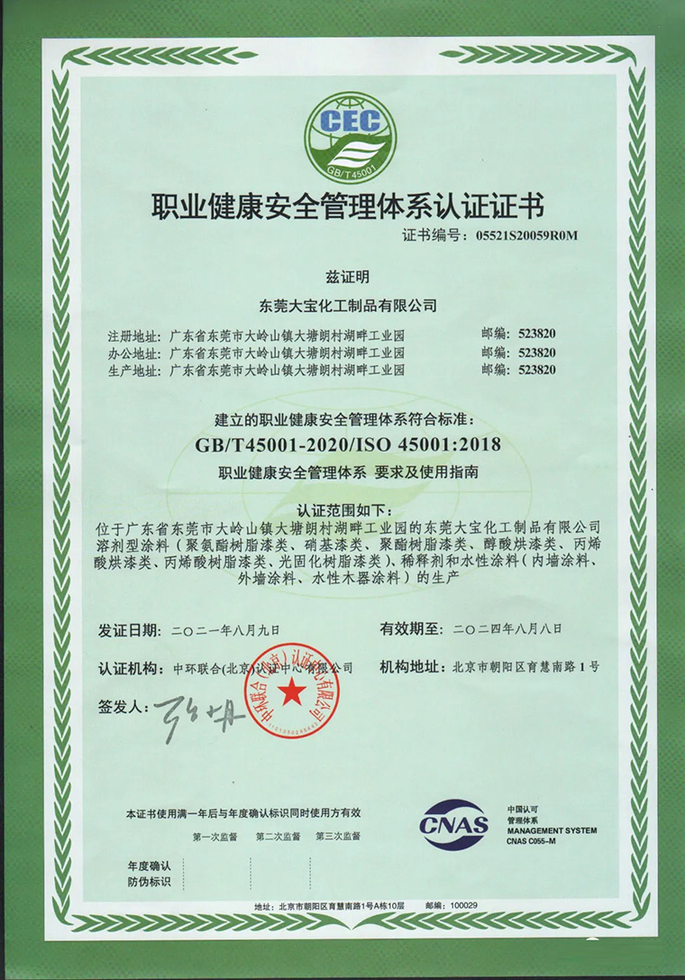 近日,大寶漆正式通過GB/T45001-2020/ISO45001:2018職業健康安全管理體系認證,意味著大寶漆獲得國際權威機構認可,將為公司后續的安全穩定與可持續的長遠發展提供強有力的保障。