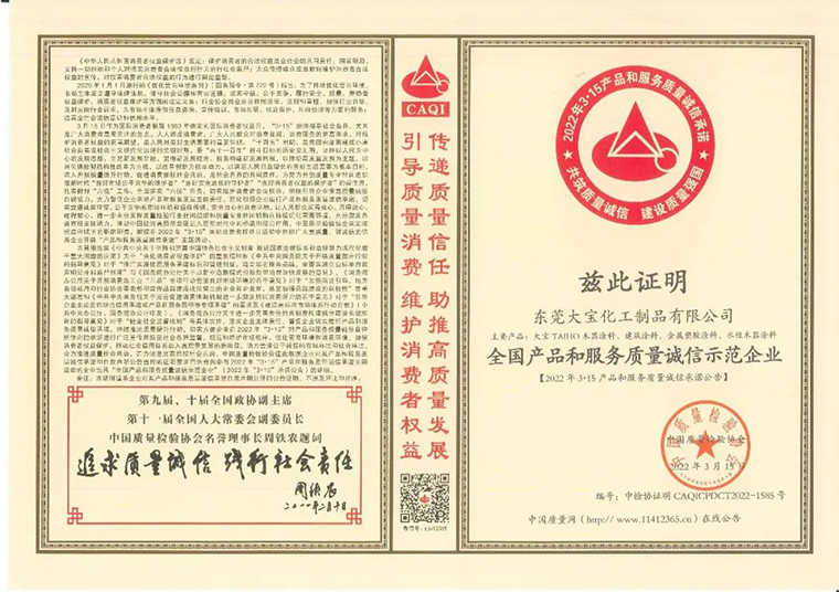 榮譽,是對大寶漆的肯定,更是推動大寶漆不斷向前發展的動力!未來,大寶漆仍將不忘初心,始終專注于高品質涂料的研發推廣,積極恪守質量誠信,踐行社會責任,以微薄之力助推國家“質量強國”建設。