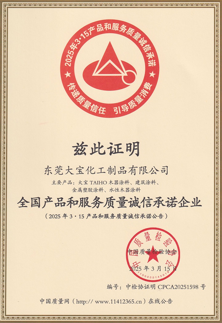 喜訊│大寶漆獲全國產品和服務質量誠信承諾企業