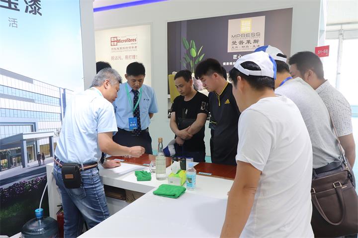 大寶漆作為國家高新技術(shù)企業(yè),緊扣“涂裝黑科技”的主題,在成都家具展重點展出了公司最近幾年研發(fā)突破的家具漆新工藝,包括:淺色科技木皮耐黃變高硬度系列、1度左右的PU全啞面漆系列、水性雙組份底面著色耐高溫系列、UV底面著色系列和格麗斯著色層次感強系列等,受到了參展的家具廠、涂料同行的關(guān)注。尤其是淺色科技木皮耐黃變高硬度系列和1度左右的PU面漆全啞涂裝系列,吸引了不少家具廠企業(yè)代表駐足觀看,了解產(chǎn)品信息,紛紛表達(dá)了合作意愿。